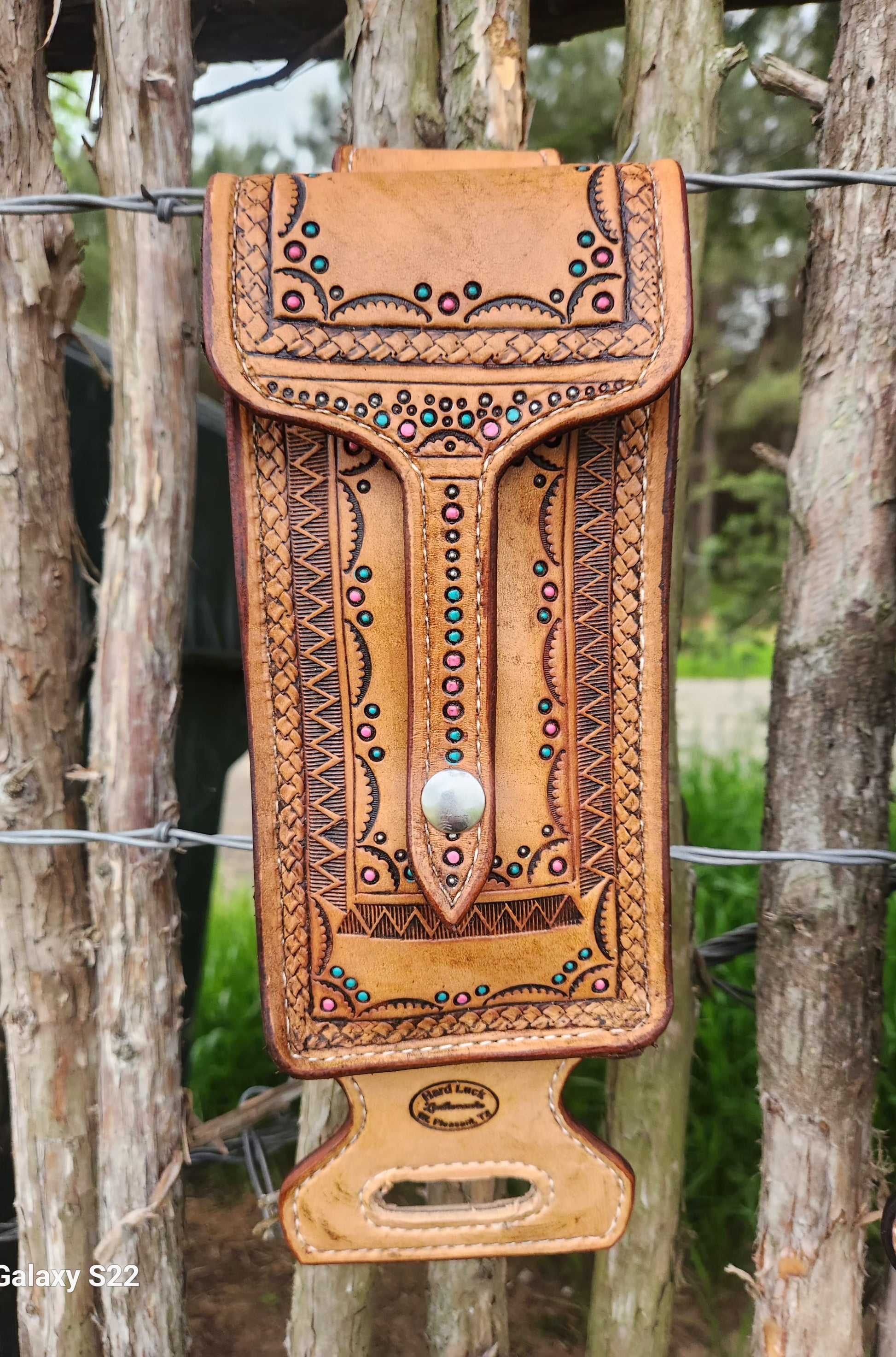 Back billet pouch. Stamped and painted. Lined with chap leather. Chap leather gusset.