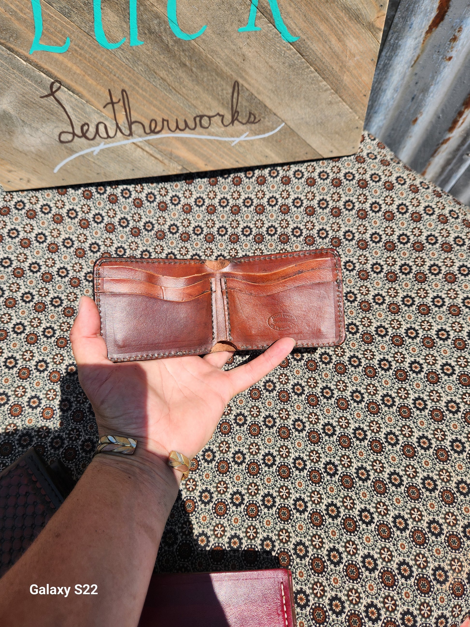 Handtooled and stamped bifold wallets. 4 card slots and a cash slot behind.