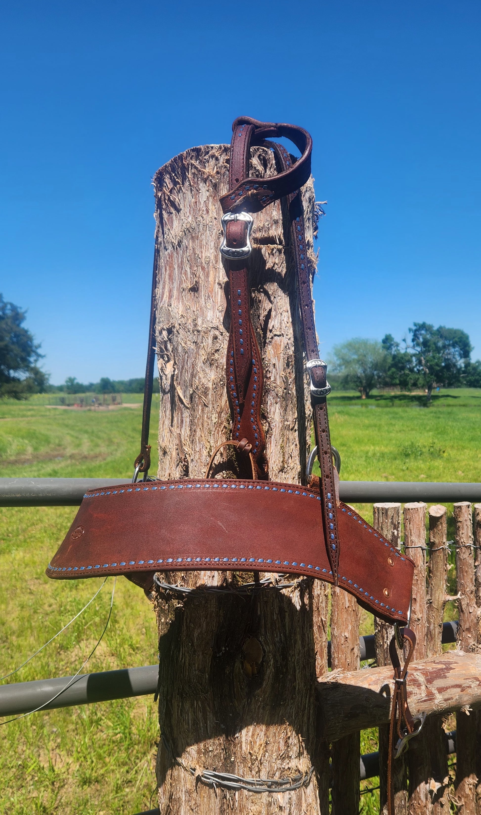 Matching blue buck stitched sliding ear headstall and tripping collar.