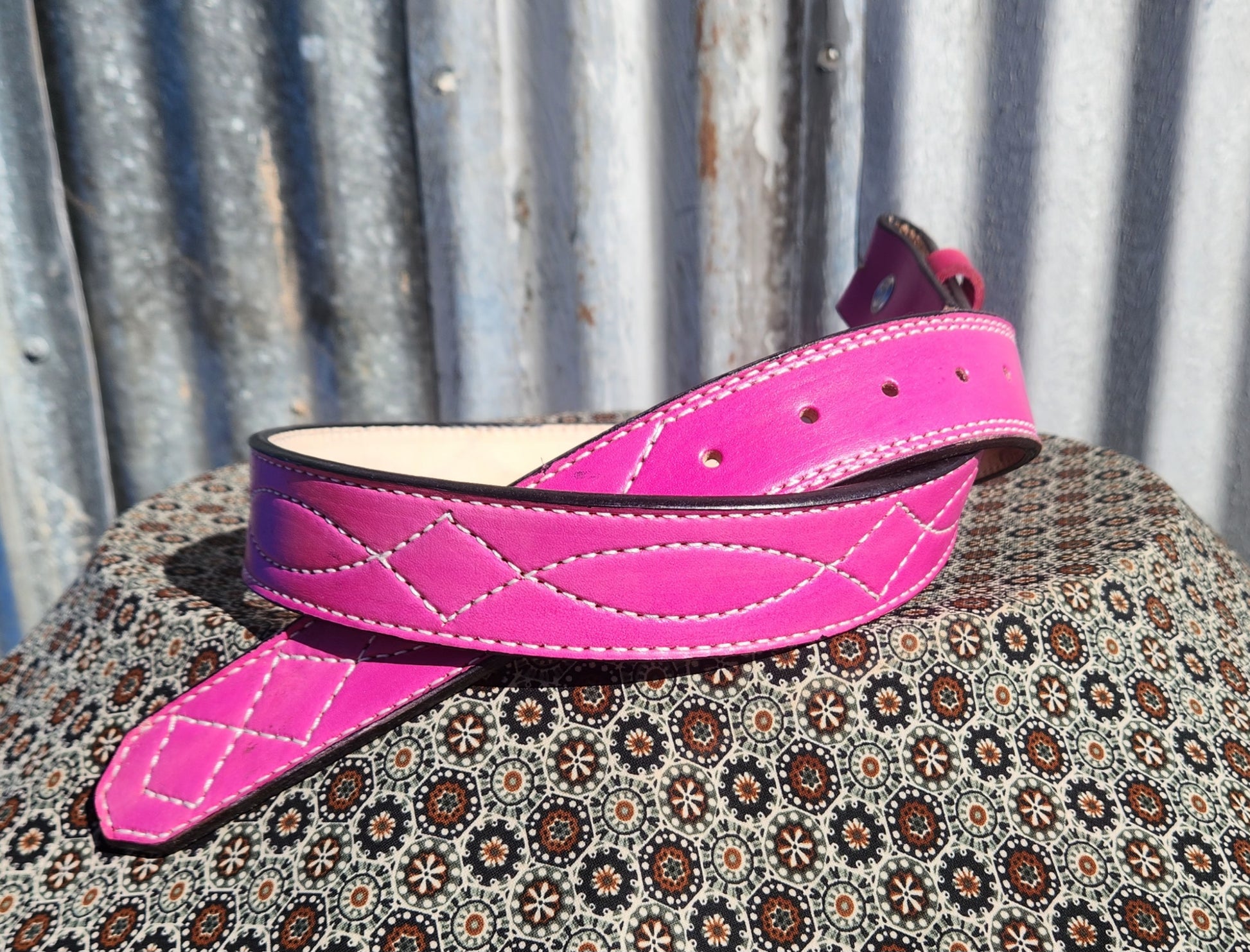 Beautiful bright pink belt with gunslinger stitch pattern. Measures 33" from buckle fold to middle hole.