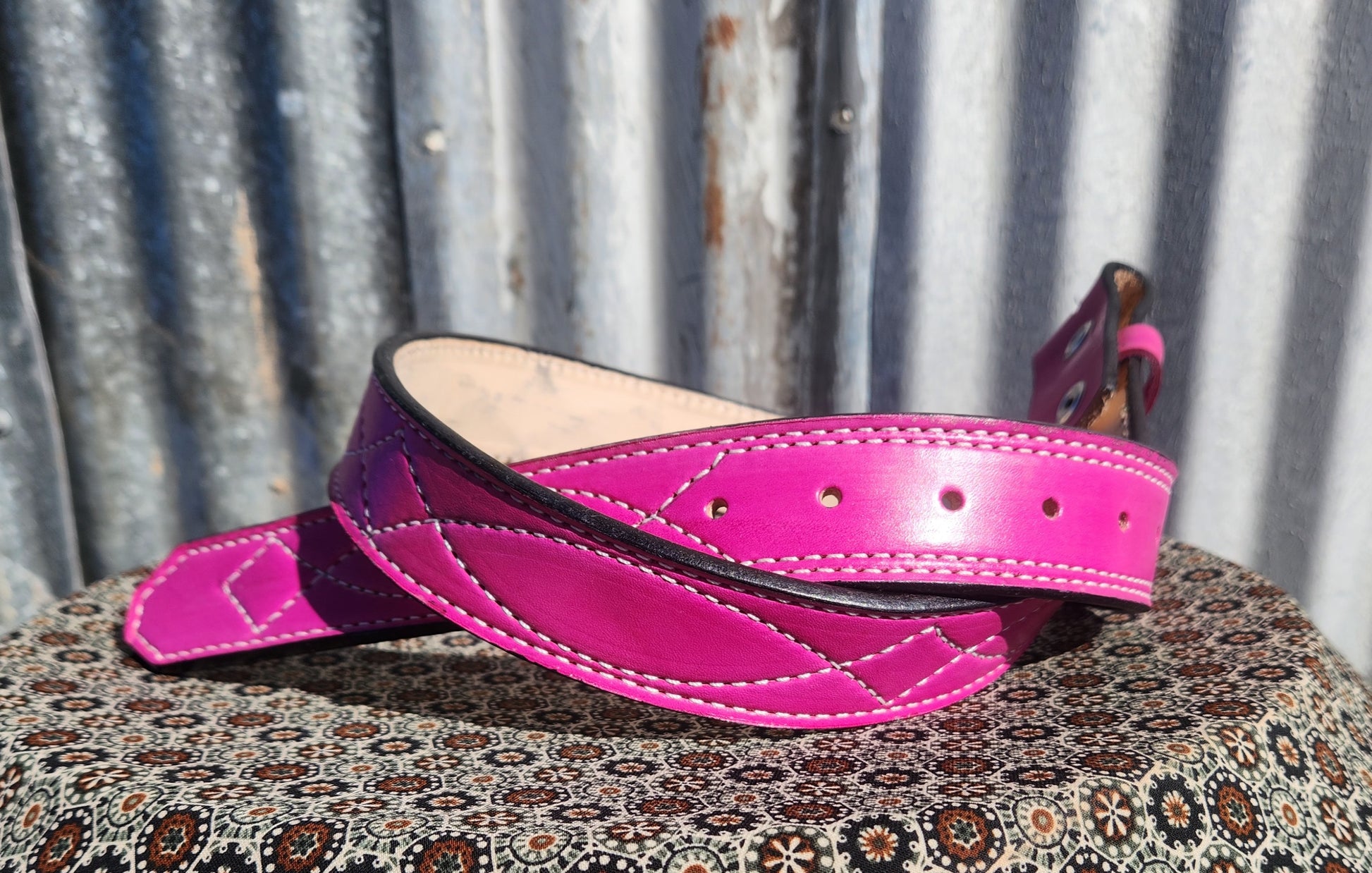Beautiful bright pink leather belt with white gunslinger stitch pattern. Measures 32"from buckle fold to middle hole.