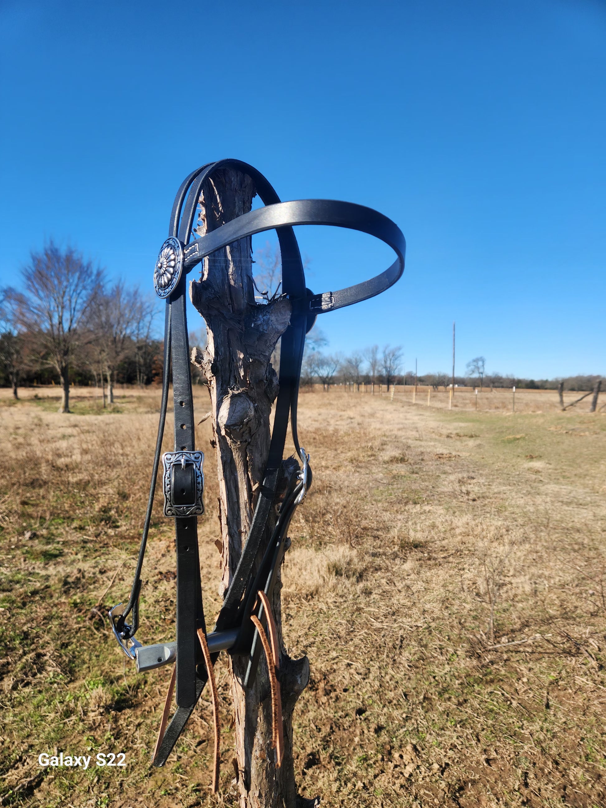 Black English bridle leather headstall. 3/4" Horseshoe brand stainless buckles and rosettes. 9-10oz leather. Hand rubbed and slicked edges. Chap leather bit loop ties.
