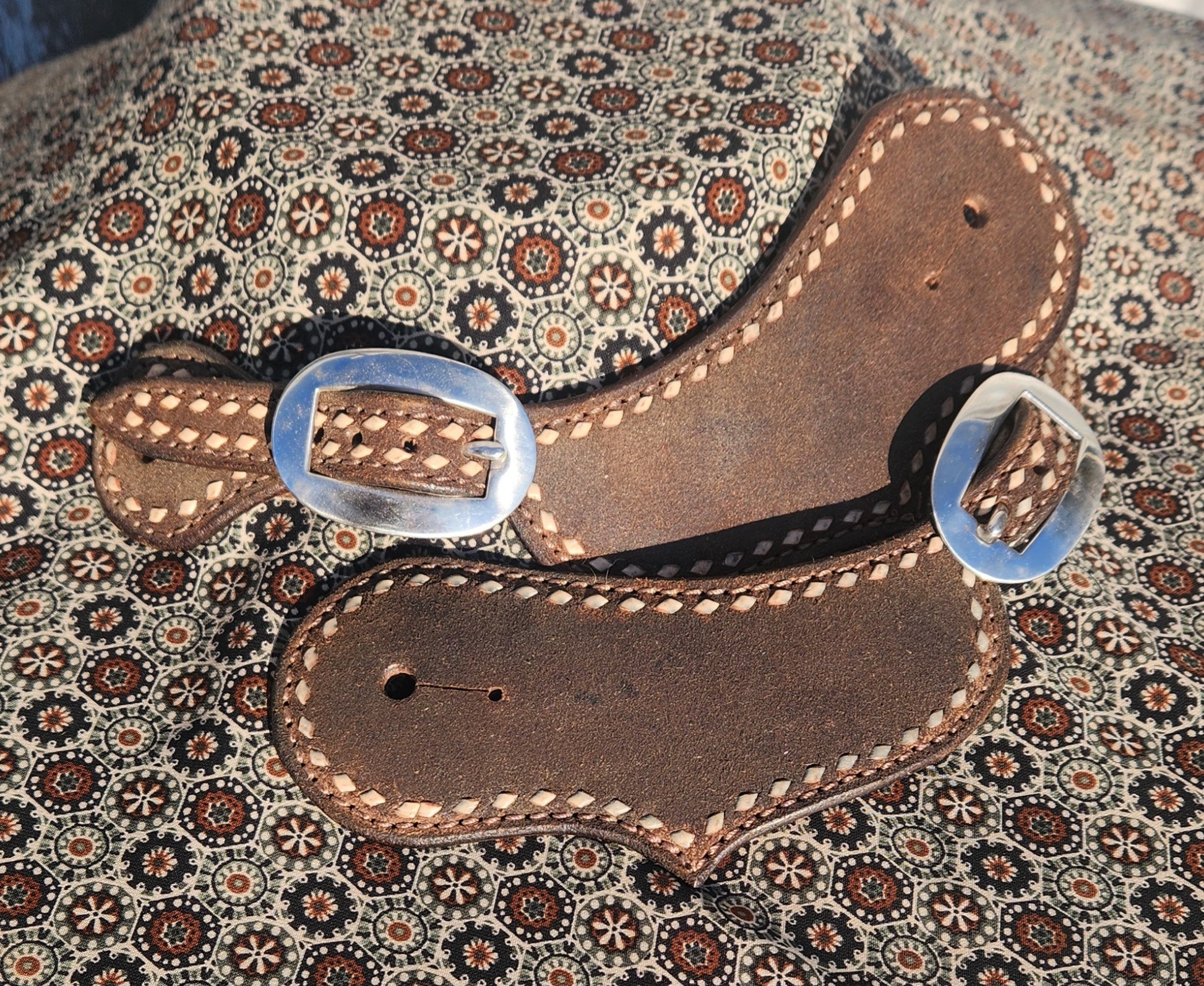 Rough our chocolate colored spur straps with a natural colored buck stitching. Stainless steel buckles. Lined and sewn edges.