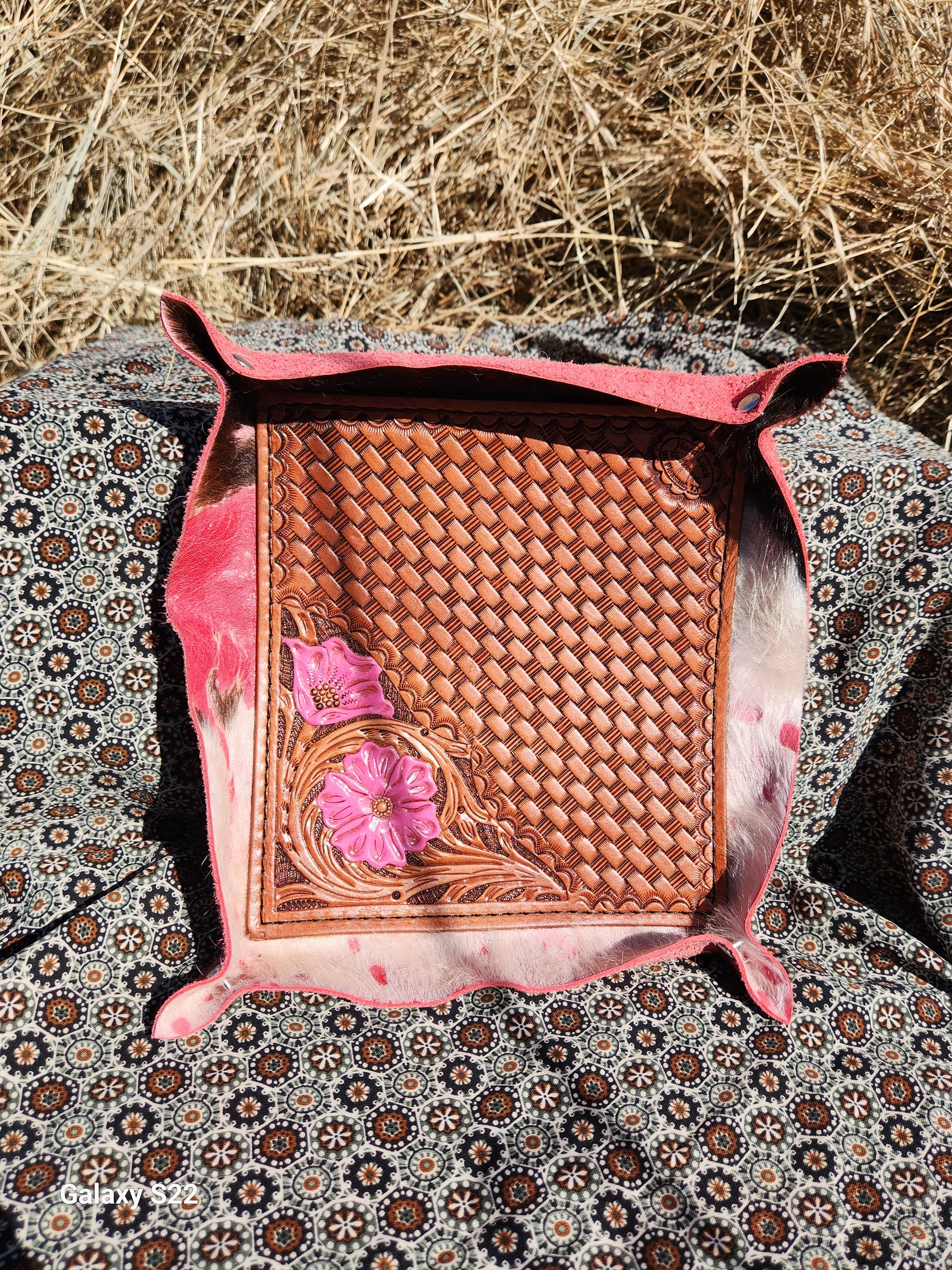 Large key trays. Tooled or stamped bottom panel is sewn in. Corners are held together with calf lace.