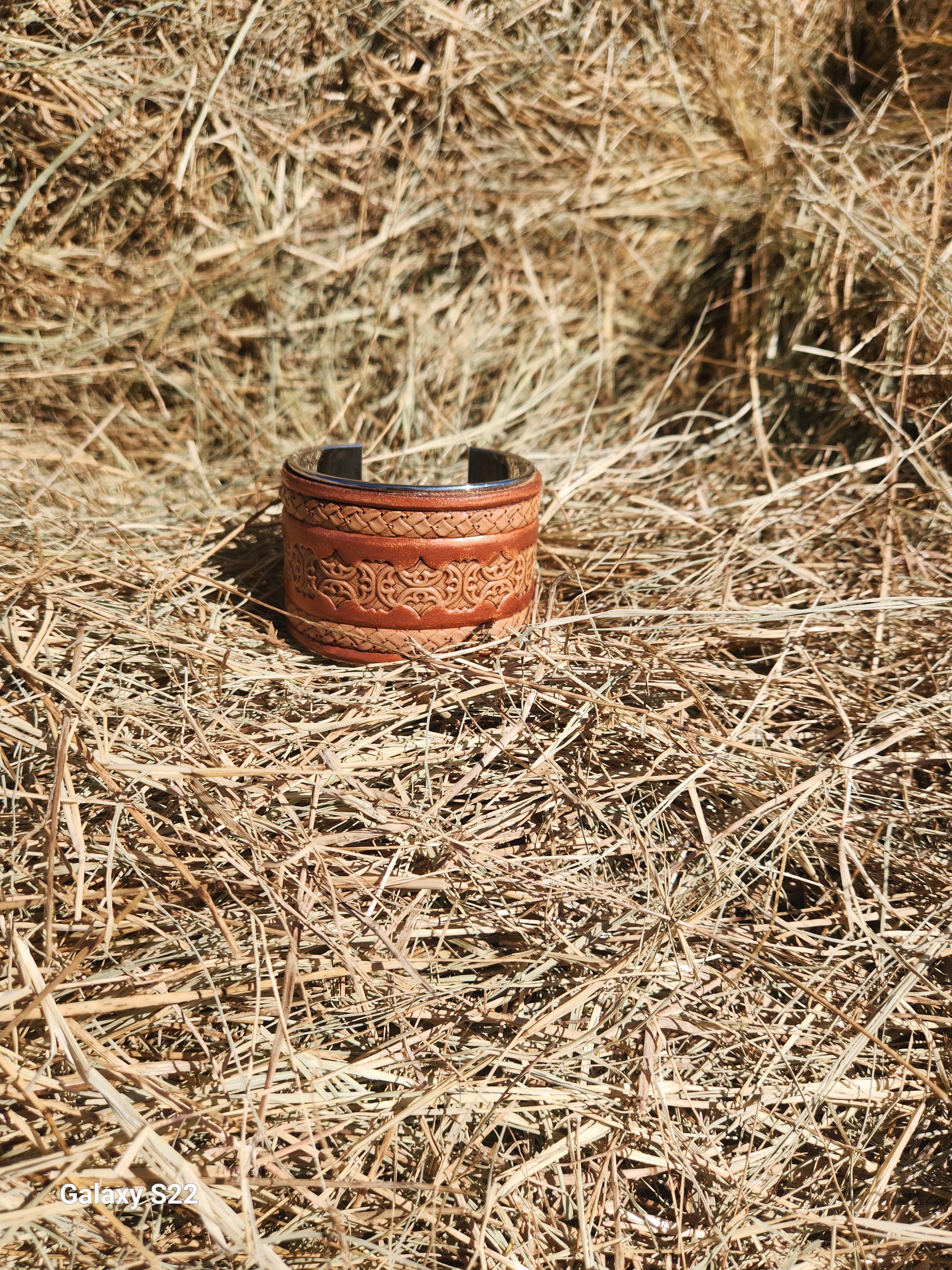 Adjustable stainless steel cuffs with leather inlay. Some stamped, some embossed leather, some hair on cowhide.