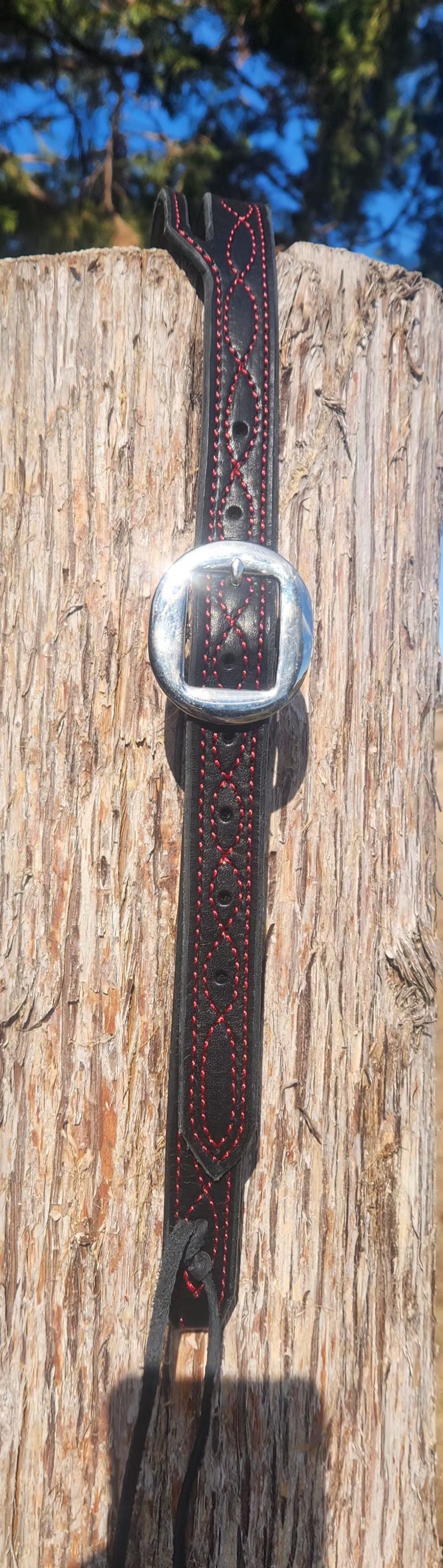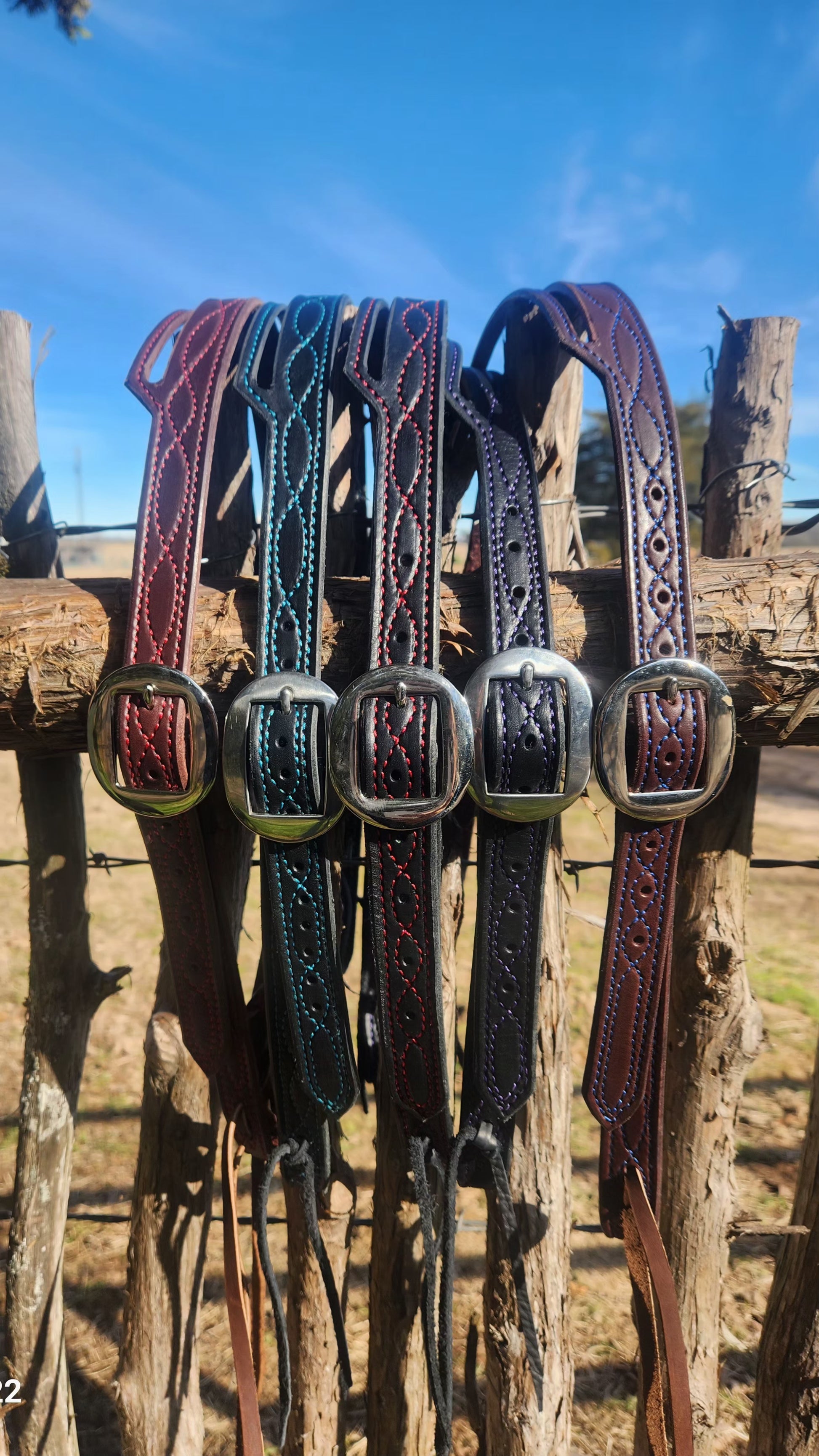 Black and brown English bridle leather headstalls. Various colors of decorative stitching.