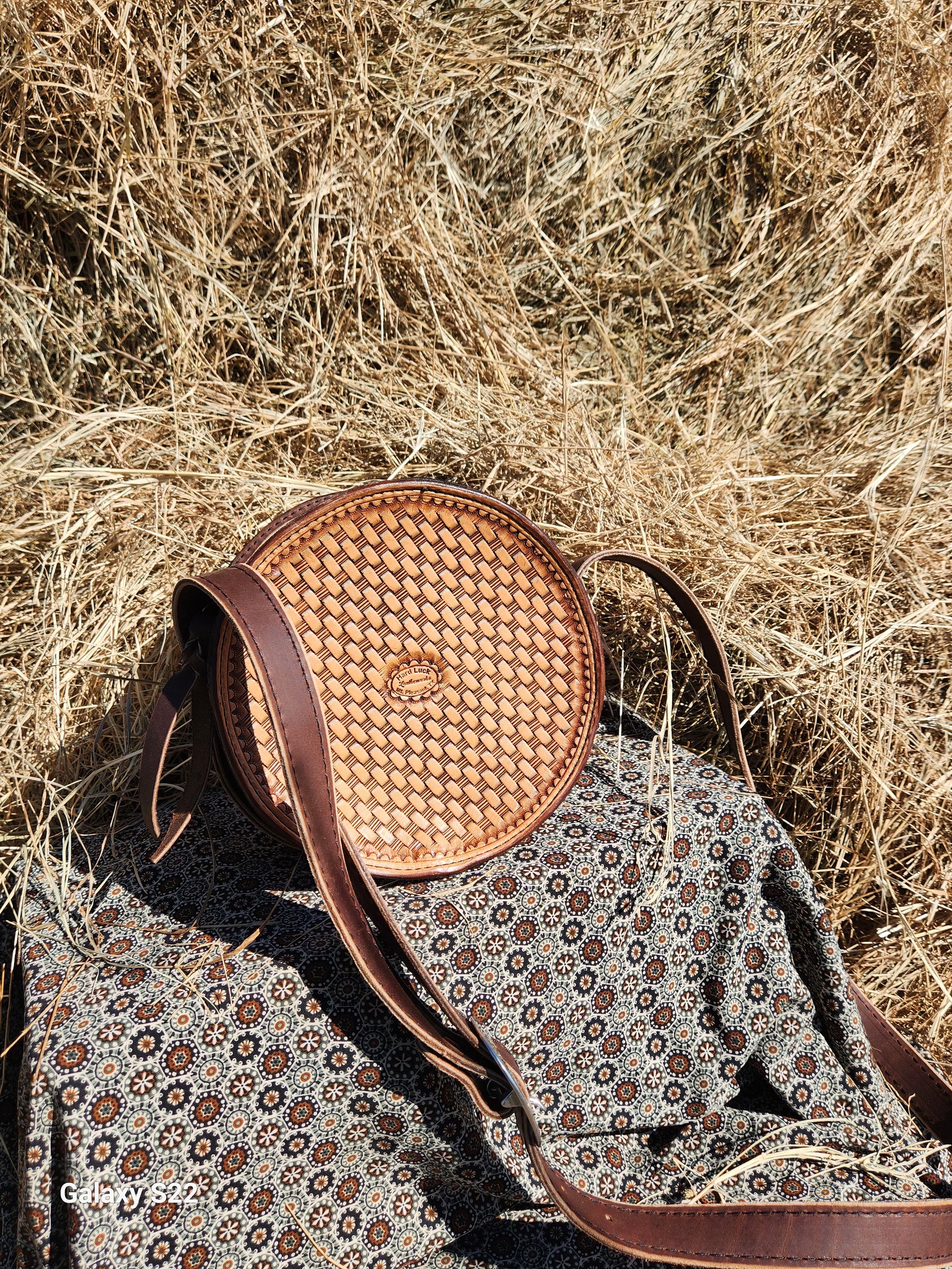 Beautiful Sunflower tooled round purse. Dyed a rich yellow and brown. Chap leather gusset. Heavy duty zipper. Chap leather shoulder strap with a stainless steel buckle.