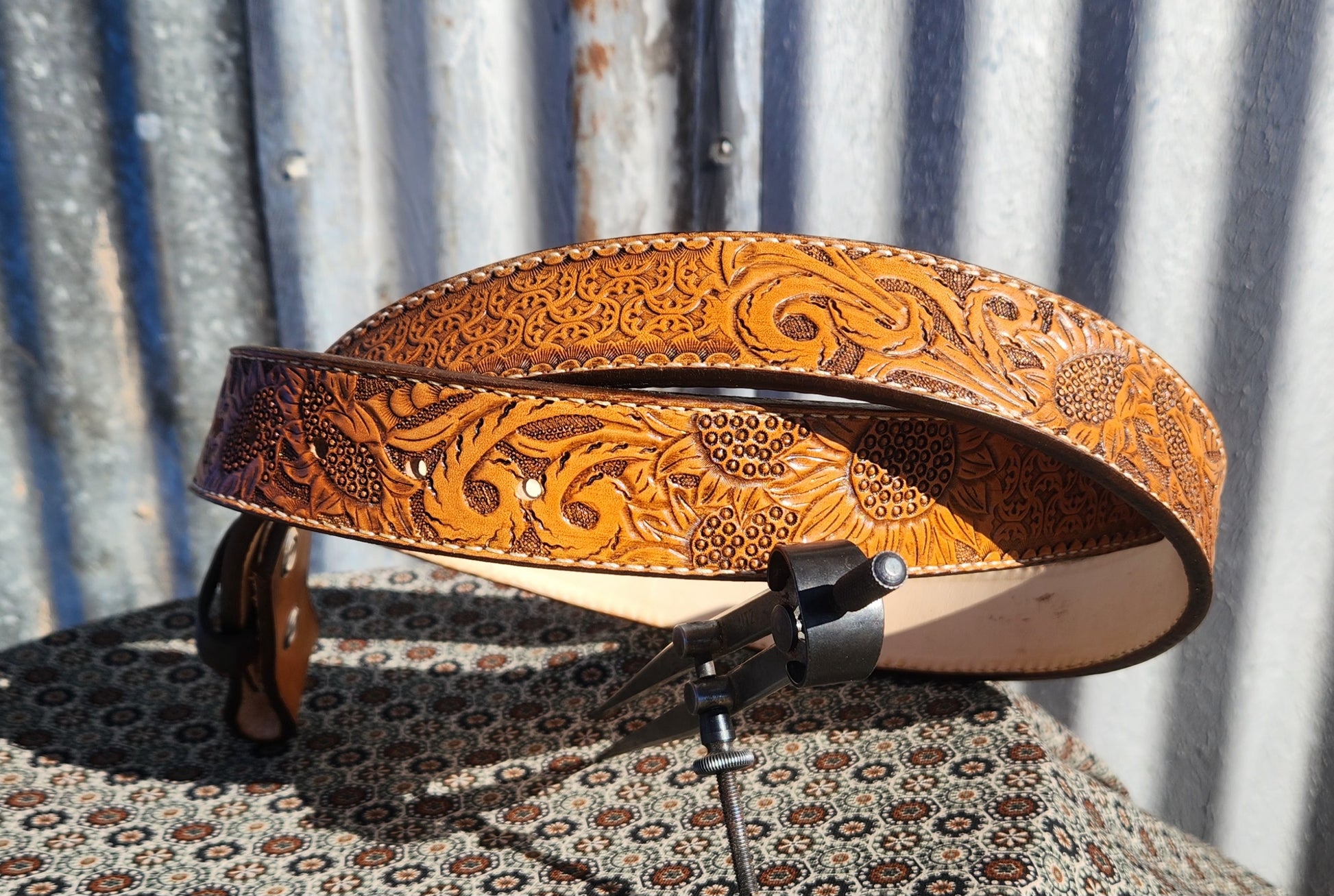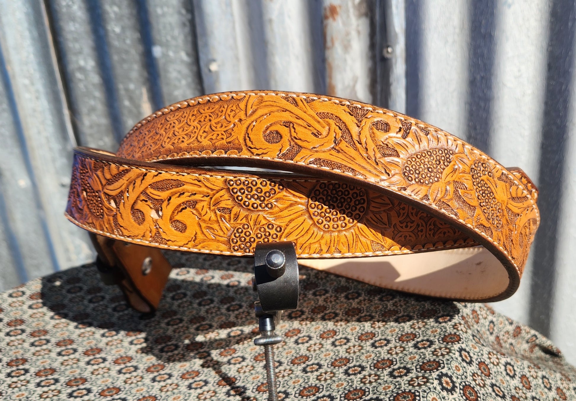 Gorgeous sunflowers tooled on this gorgeous belt. Alternated with stamping. Saddle tan antique finish. Measures 36 inches from buckle fold to middle hole.