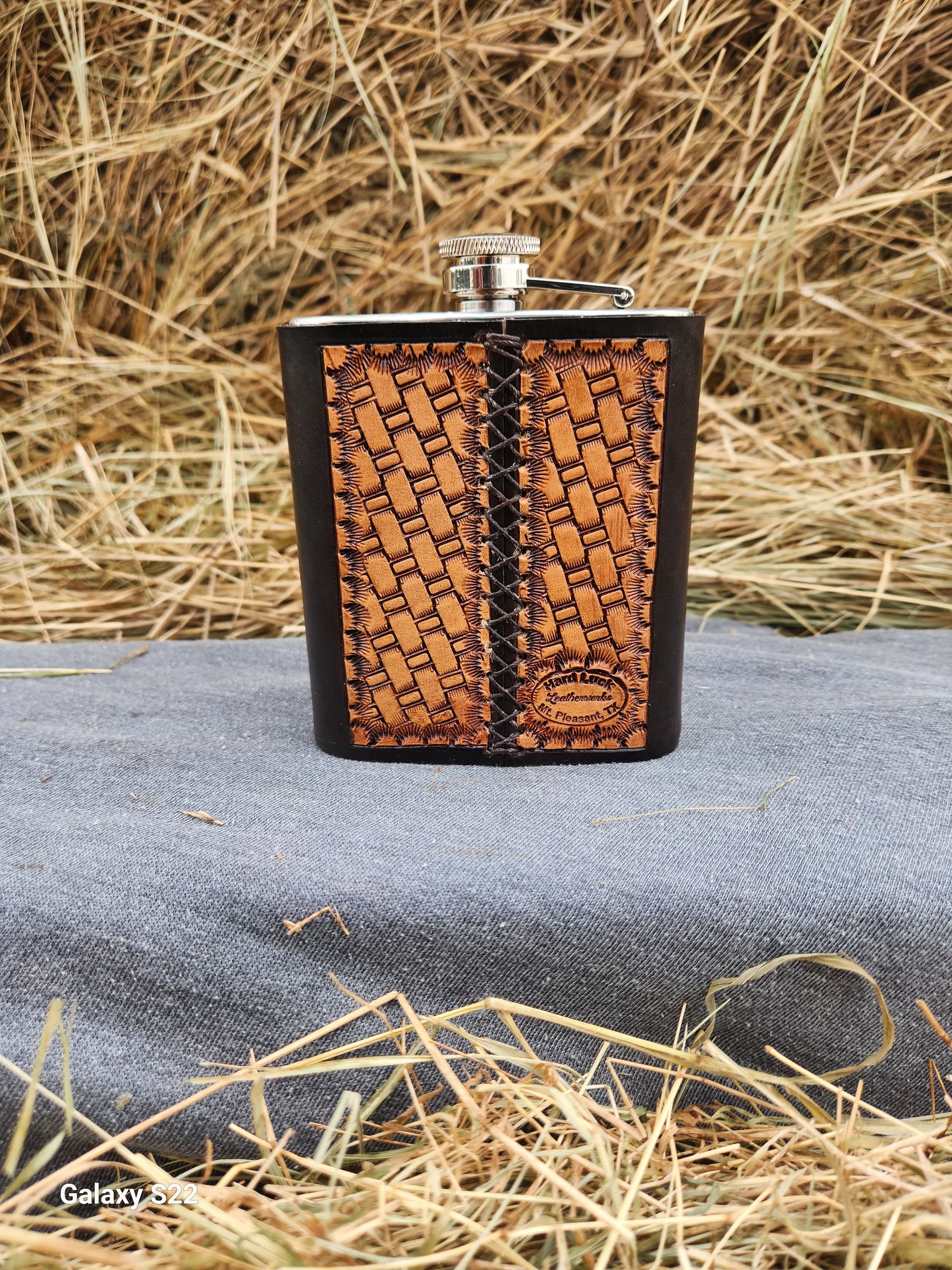 These beautiful flask sleeves are hand tooled, stamped, and dyed. They are laced together on the backside with a heavy waxed thread. The 8 oz stainless steel flasks are included. The leather sleeves are made one at a time. Each one is unique.