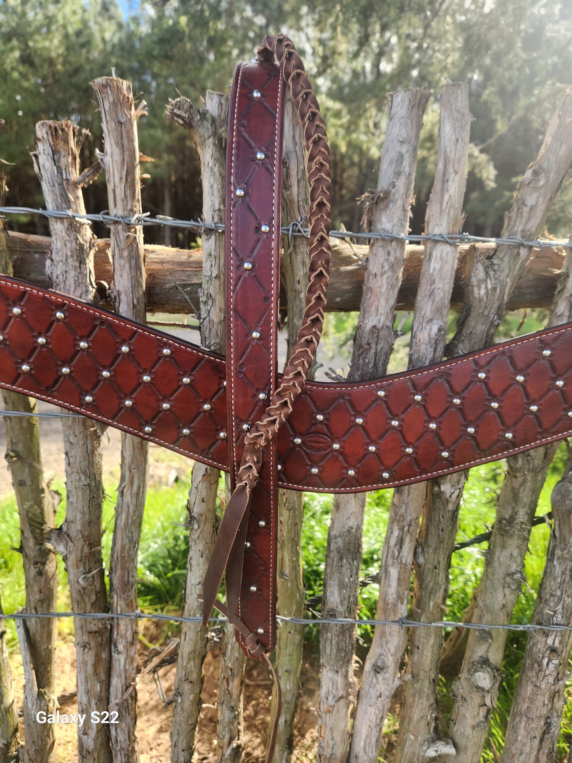 Gorgeous handmade headstall and matching tripping collar. British tan dyed Live Oak leather, lined with a tough chap leather for softness and durability. Stainless steel hardware.