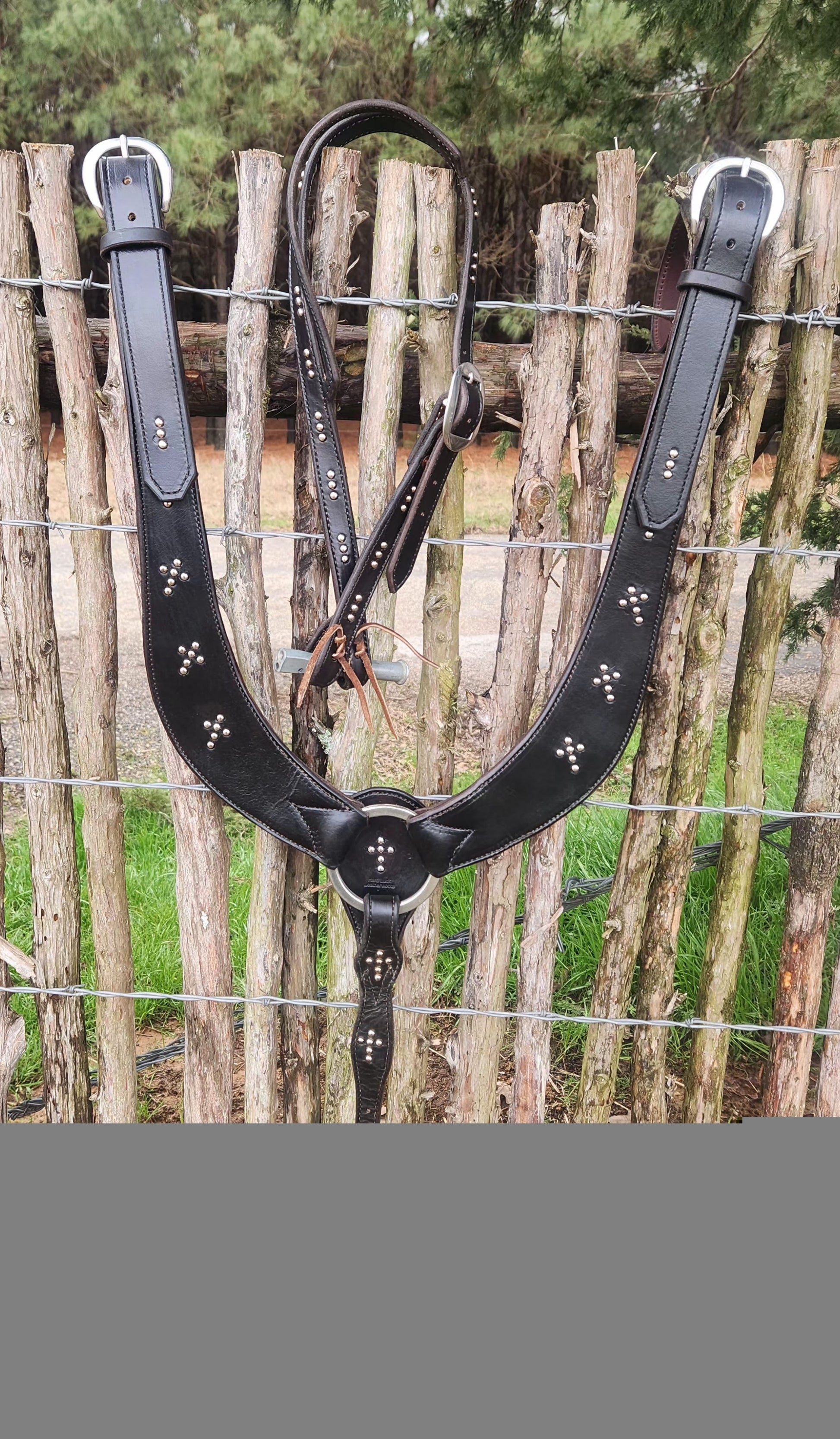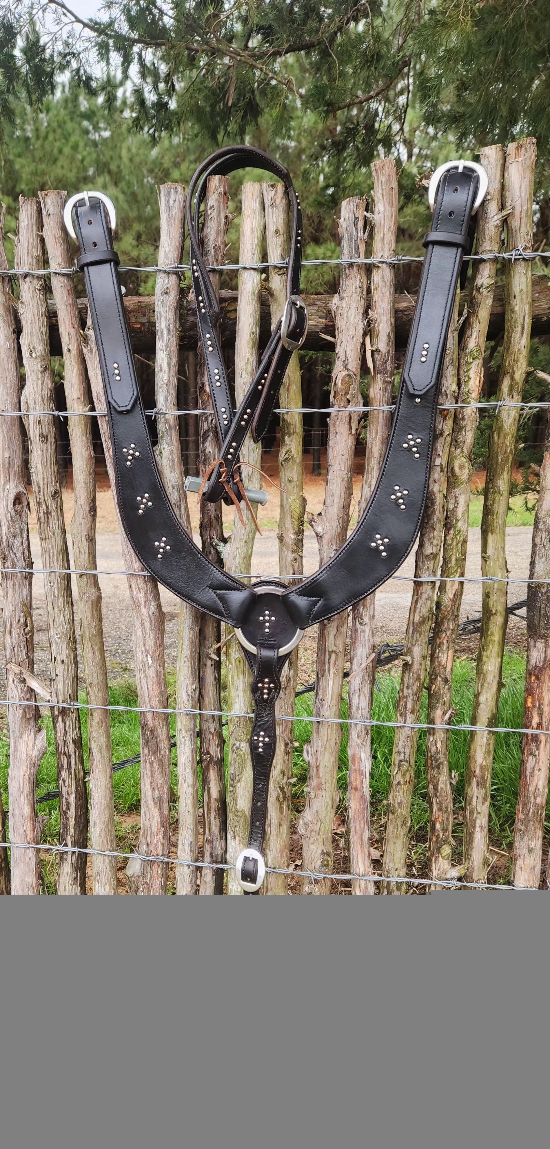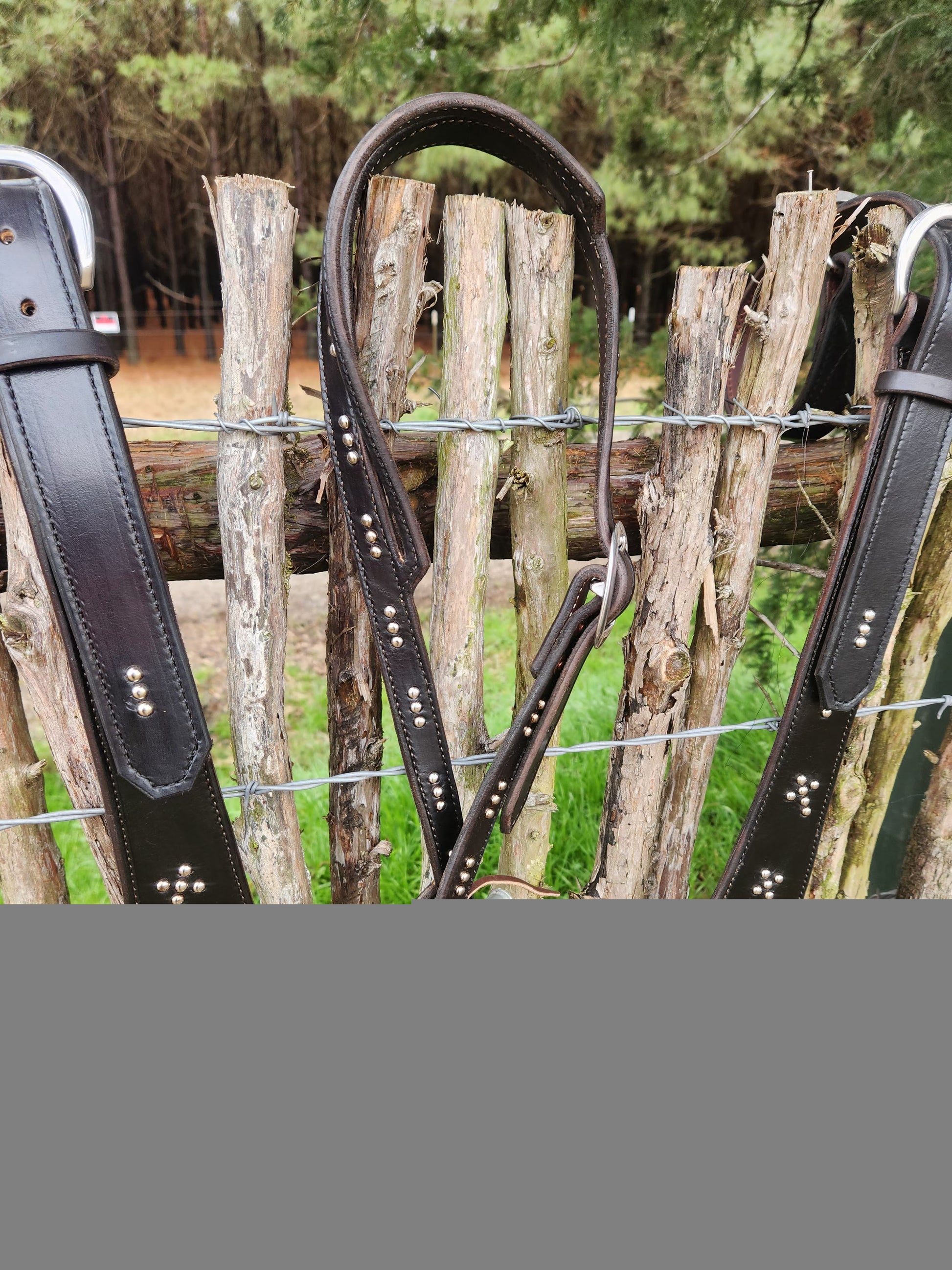 Dark chocolate brown slit ear headstall with a matching pulling collar. Nickle spots. 3 crosses on each side of the pulling collar, 3 down the center. This set is lined with chap leather and packing stainless steel hardware. Class and simplicity all in one.
