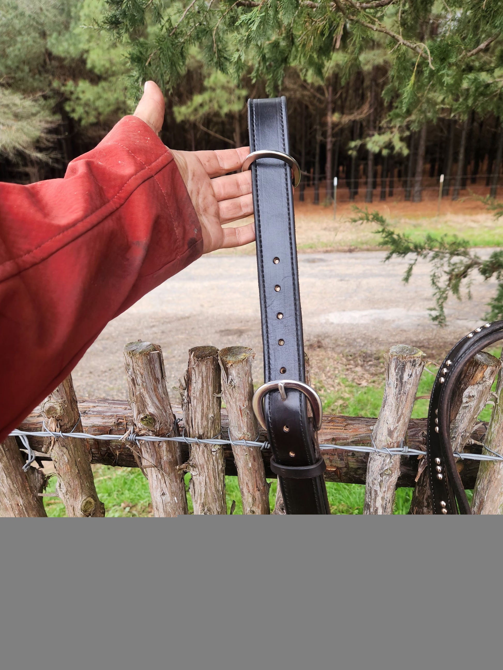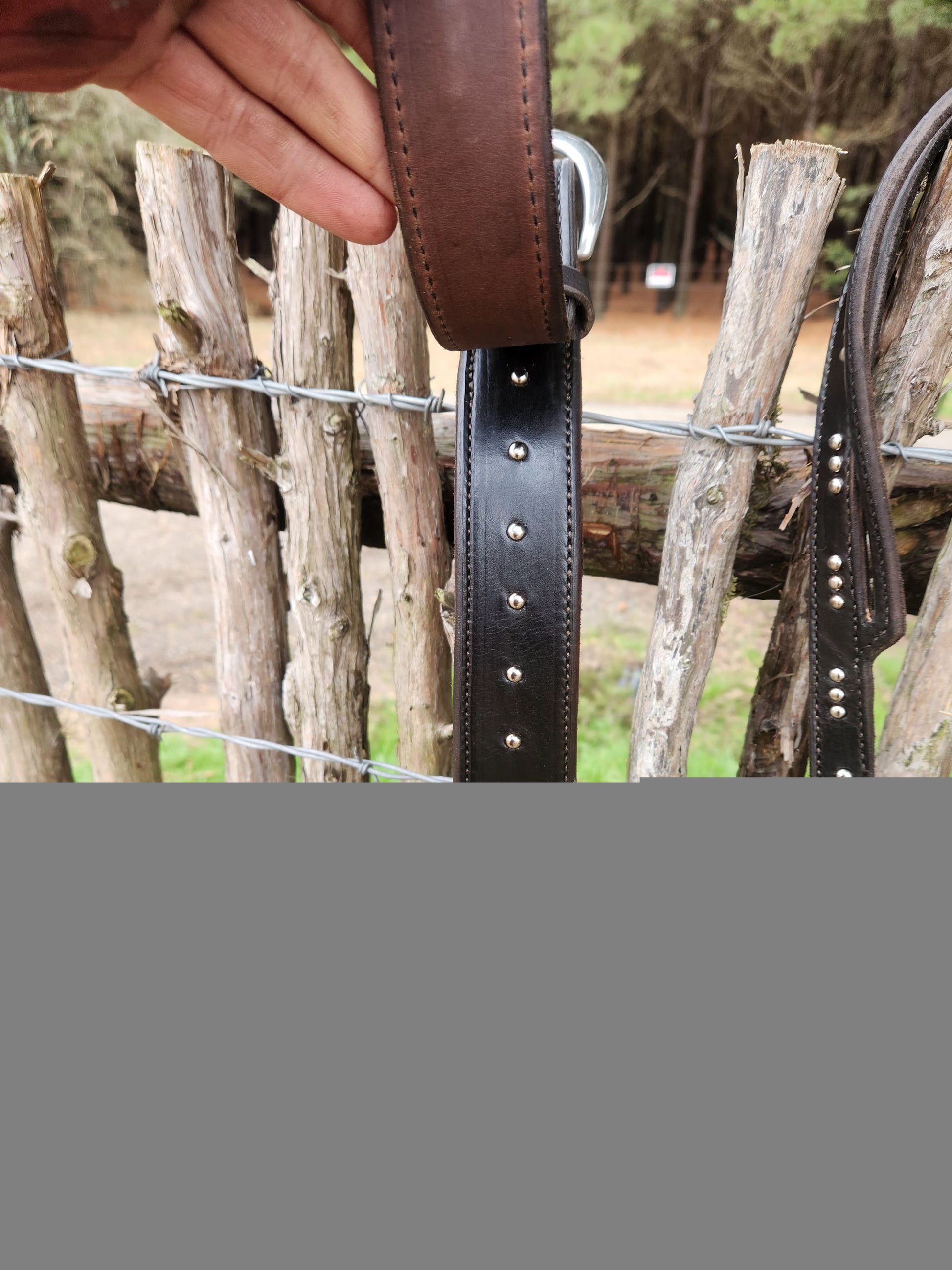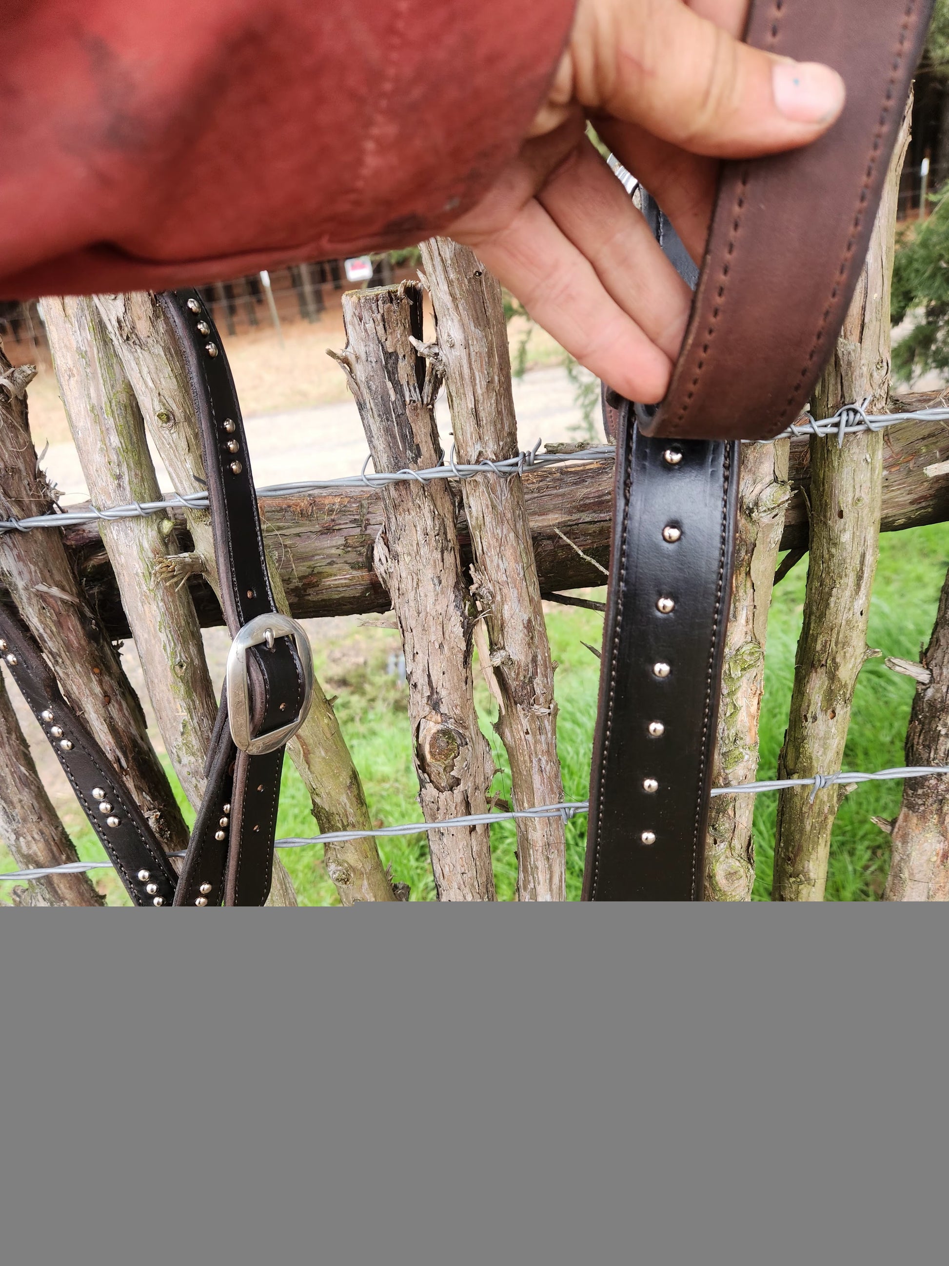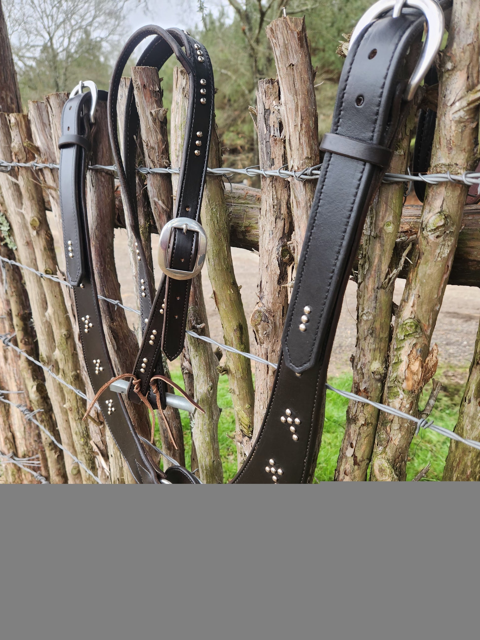 Dark chocolate brown slit ear headstall with a matching pulling collar. Nickle spots. 3 crosses on each side of the pulling collar, 3 down the center. This set is lined with chap leather and packing stainless steel hardware. Class and simplicity all in one.