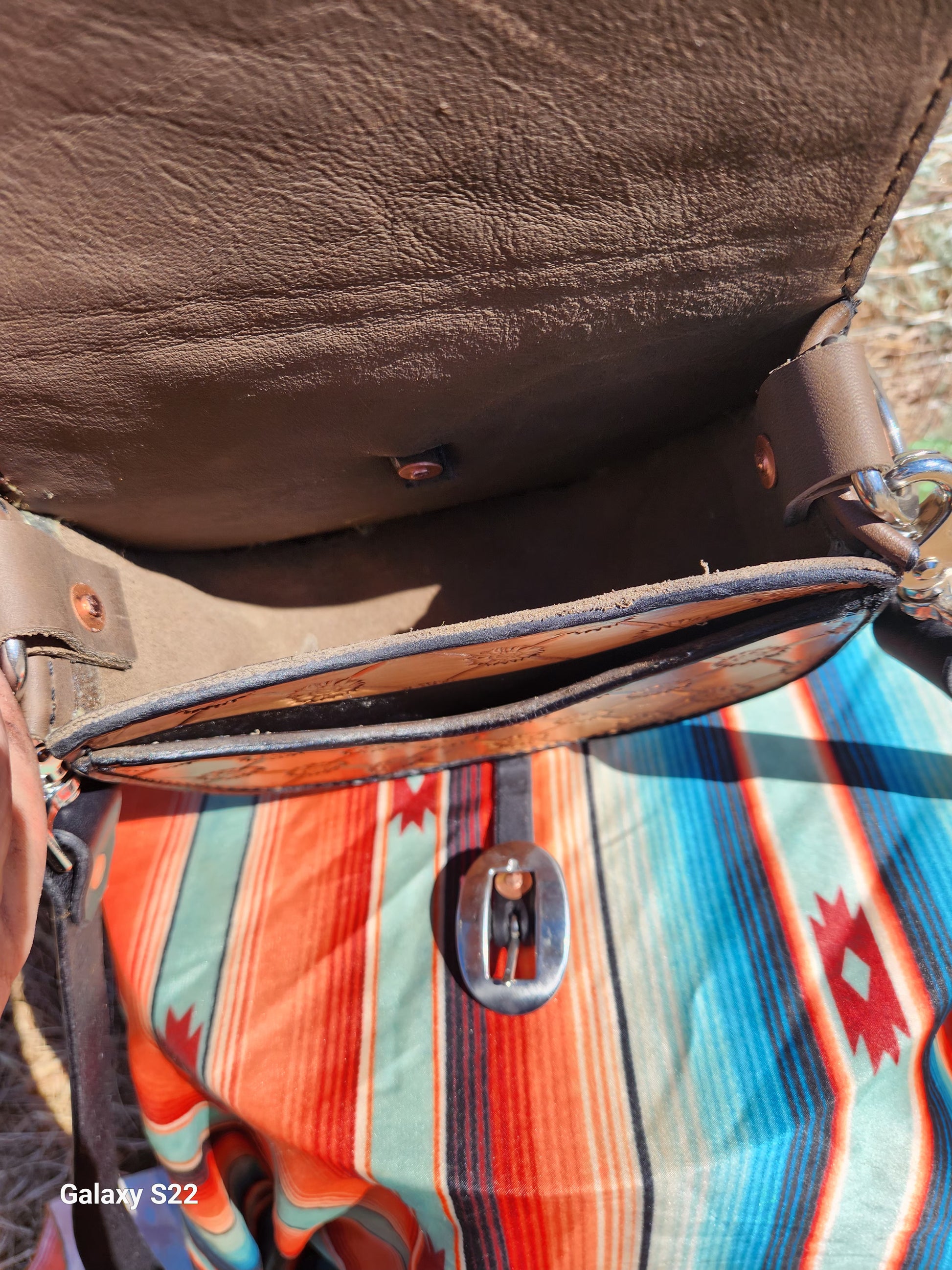 Cute little crossbody saddle bag purse. Handmade. Sunflower stamp quilted pattern. This purse is lined with a dark olive green leather. The same leather is used for the gusset. Stainless steel hardware.
